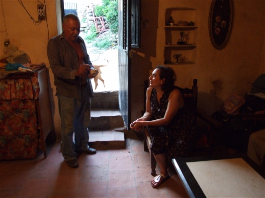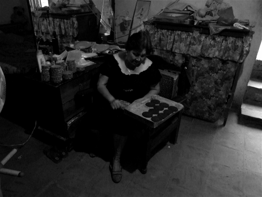 Tia Rosalina with some cocoa "cakes" for making hot chocolate. She roasts the cocoa beans and grinds them with cinnamon and sugar, puts them in a little mold, lets them dry and wraps them in wax paper.