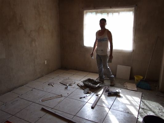 Chuy putting tile down in one of the rooms upstairs. Pretty warm work.