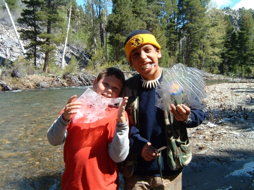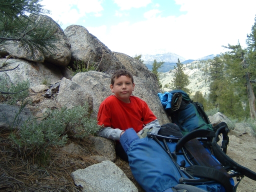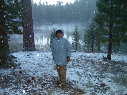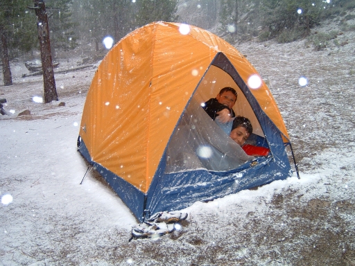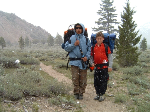 Carlos, James and I left around 6:30 on Saturday, May 29th? for an early summer trip in the Sierras. I have little experience in the early season up. I was just hoping for the best. Angelica couldn't make it because she had to work half the weekend on a big project. About 40 miles before Sonora Pass I stopped at a ranger station for a wilderness permit and they informed us about the "unsettled" weather that had brought snow to the region. They said more was coming and in the worst case we might have to find another highway home if it snowed heavily, forcing the closure of the pass, but the ranger said it was his policy to live dangerously. We forged on. The pass had just opened a few days earlier. It was beautiful, an alpine pass just opened, and spitting snow. We made Leavitt Meadow an hour later, hoisted our packs and plodded on. We hit the lake a few hours later. The altitude is only 7,300, but for us that's thin air. Not long after we arrived the sky darkened , the wind picked up and the snow came in at less than a 45 degree angle. I didn't know what to expect -- if it would continue -- so I was a little concerned. In the end, it was just off and on snow flurries, little accumulation, a cold night alrighty, but we survived. With the three of us in the tent that night, it was like a wet cave in the tent, with all our exhaled moist breath condensing on the tent . Carlos was the first up (dang it was cold) and when he crawled over us and opend the fly,a shower of very chilly water came down on our heads. We took a really fun hike the next day, but without Mom, and not really cherishing the idea of another night like that, and also thinking it would be nice to spend Memorial Day with Mom, we bailed and came back on Sunday.